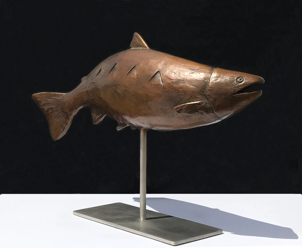This fish was originally sculpted to commemorate Kenneth Schwartz, architect and respected Mayor of San Luis Obispo, CA. He was also the guiding light for the Tekusk’ Wa Suwa sculpture of the Grizzly Bear and the Chumash child sculpture in the Mission Plaza. I was searching for another form that would honor the spirit of the Indigenous people and wildlife who inhabited this part of the planet before the Spanish and Europeans arrived. There was a creek nearby that, at one time, supported Steelhead fish on their way home from the ocean.