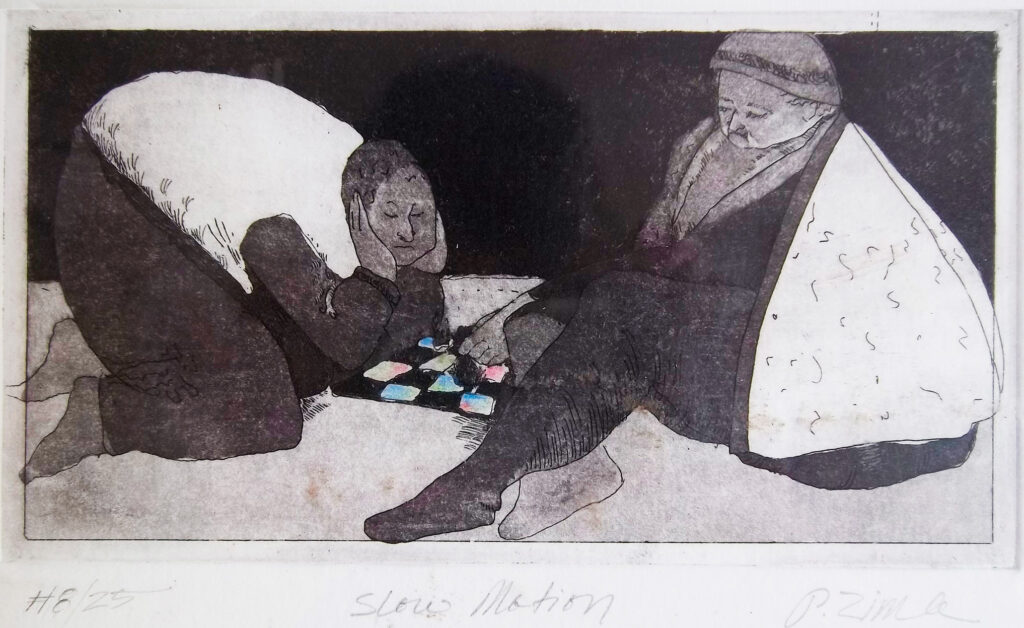 with the tones with a process called aquatinting, dipping it in the acid for just the right amount of time, running it through the press, seeing the image come up on the other side, carefully pulling the blankets off, and the wonderful heavy paper up, to see how it turned out.