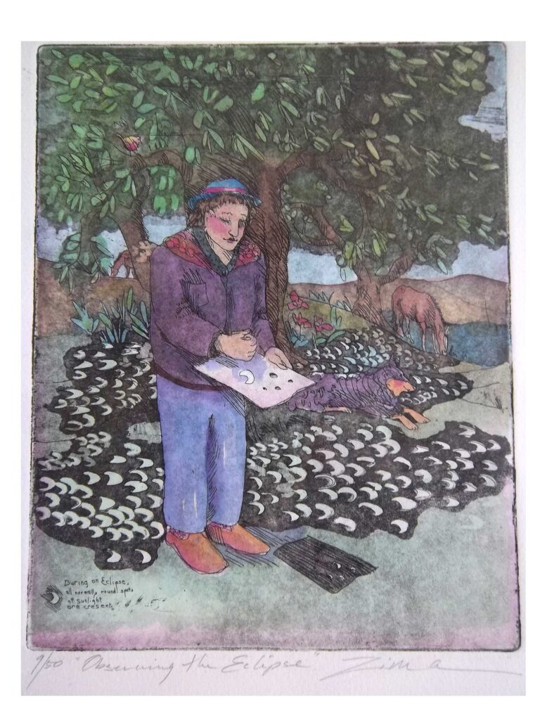 loose fist, she said in a petulant way, ” I just don’t get the thing about using our hand to watch the eclipse!” I had my sketchbook with me and held my hand over it similarly to how she had been holding hers. There was a partial circle of bright light on the page! I looked down and saw the same shape repeated under the trees. Every normally round spot of sunlight becomes a crescent as the eclipse progresses, fantastic!