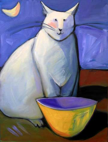 and Bowl Series, A Non-Serious Investigation into the Art of Listening." This brave strong cat is posed beside an empty bowl. The zen question might be, what is empty? Is it lacking something, or is it an emptiness that allows for filling? For this artist, the cat represents well being, the bowl, a quiet mind and the crescent moon is a matter of perspective: from another viewpoint it’s full. |