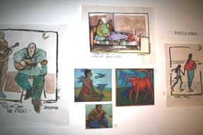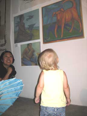 Albuquerque. It was up only for the weekend. It was called the "Summer Salon Show with the Daily Painters New Mexico", at the SCA Contemporary Art gallery. Here are some quick photos I took of my exhibit space. I showed some paintings that were actually in progress and some of the large wash drawings on paper, unframed. The large drawings were directly derived from my sketchbook. One from Portugal, and one from observing the kids in the skating rink -before actually getting around to putting on my own skates, and one from following a large horse around my backyard. The last photo shows one of my admirers, she loved the "Skaters" the best. Back to work, See you in a while! ~ Paula Feedback? Questions? Talk to me... Thank you! |