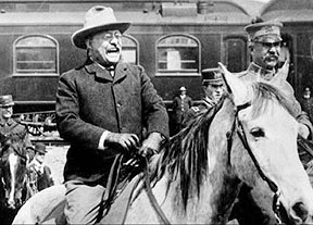 ![]() ![]() Most of the photos show TR wearing his pince-nez ("ponce-NAY"). His pince-nez glasses case helped to save his life during an assassination attempt. The portrait of him on Mt. Rushmore shows him wearing them, but I like the look of him wearing what was called "Riding Bow" glasses, for active people, that often rode horseback. I used to wear an antique pair back in my hippie days... wait, didn't John Lennon wear something like that too? ![]() |