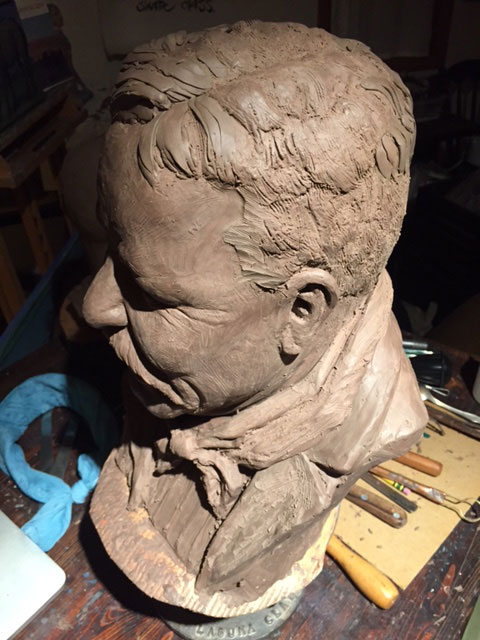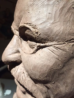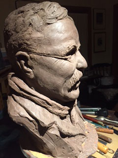 January , 2017 Here the study is continuing with more shaping, I keep adding, and then taking away, looking for reference at as many photos of TR as I can find from around the time period of his 1903 Loop Tour. Good thing I'm working in clay, not stone. (That's why people do studies before tackling the final piece!) |