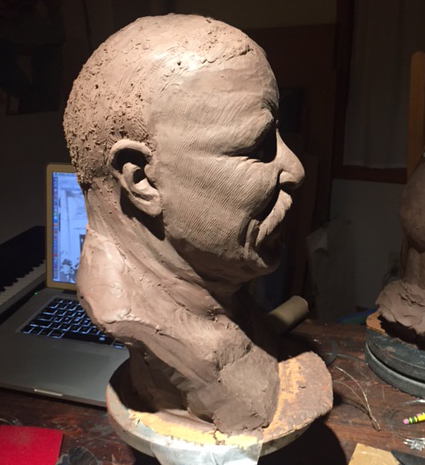 January , 2017 I've been shown the wisdom of working from the skeleton on out, rather than just working with the surface features... we'll put a jacket on him pretty soon. Here the hair is starting to go on over his skull. I'm looking at photos from various public photos, as well as hair styles of the time to understand it better . |