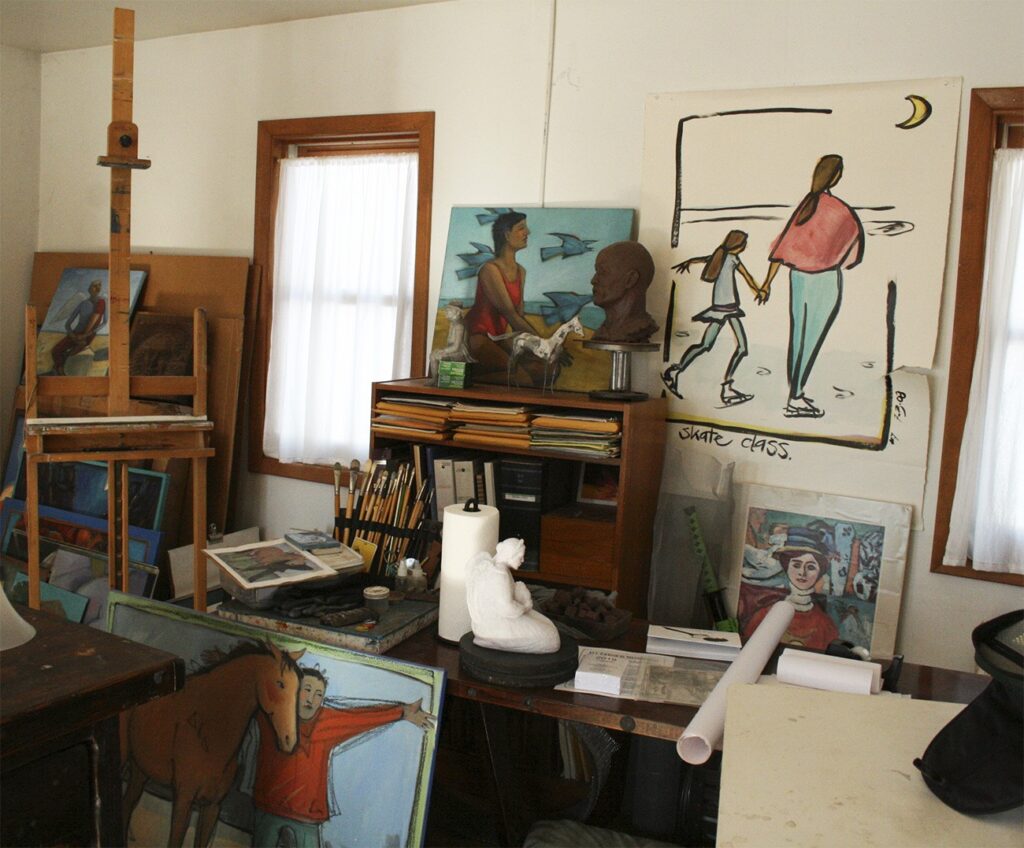 Here’s a view of Paula’s beloved painting studio, a bit messy and crowded, but still my favorite place. There’s a poster of a painting by Henri Matisse in there. Can you find it?