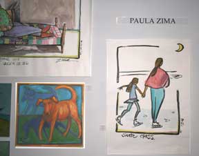 Albuquerque. It was up only for the weekend. It was called the "Summer Salon Show with the Daily Painters New Mexico", at the SCA Contemporary Art gallery. Here are some quick photos I took of my exhibit space. I showed some paintings that were actually in progress and some of the large wash drawings on paper, unframed. The large drawings were directly derived from my sketchbook. One from Portugal, and one from observing the kids in the skating rink -before actually getting around to putting on my own skates, and one from following a large horse around my backyard. The last photo shows one of my admirers, she loved the "Skaters" the best. Back to work, See you in a while! ~ Paula Feedback? Questions? Talk to me... Thank you! |