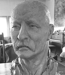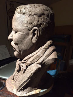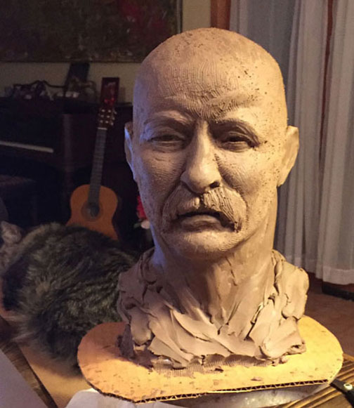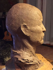 January , 2017 I've been shown the wisdom of working from the skeleton on out, rather than just working with the surface features... we'll put a jacket on him pretty soon. Here the hair is starting to go on over his skull. I'm looking at photos from various public photos, as well as hair styles of the time to understand it better . |