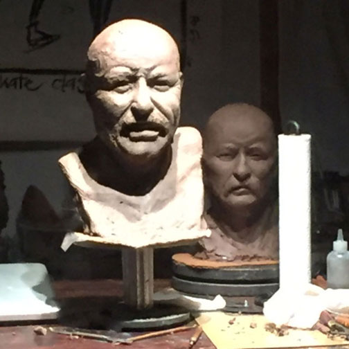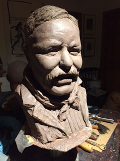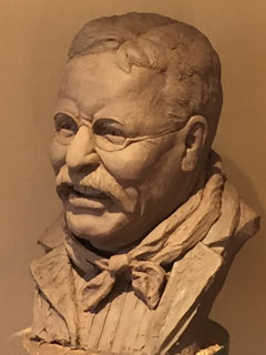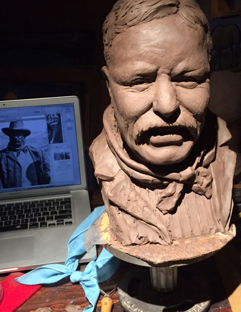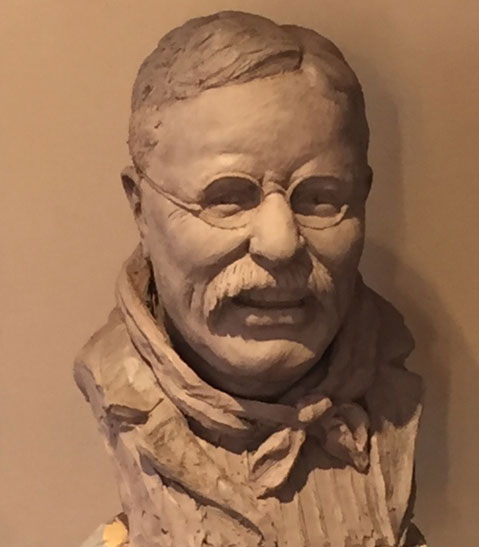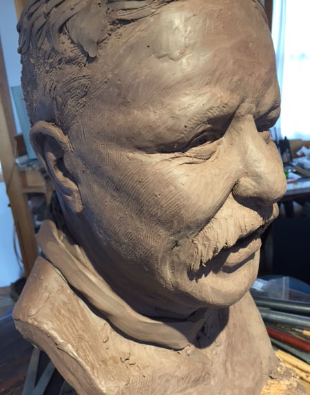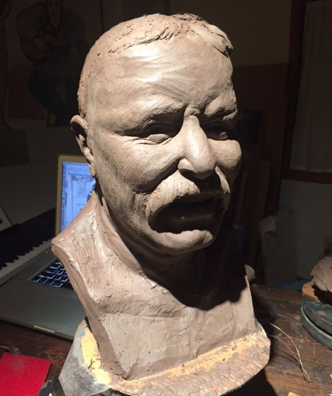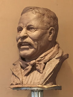 January , 2017 Here the study is continuing with more shaping, I keep adding, and then taking away, looking for reference at as many photos of TR as I can find from around the time period of his 1903 Loop Tour. Good thing I'm working in clay, not stone. (That's why people do studies before tackling the final piece!) |