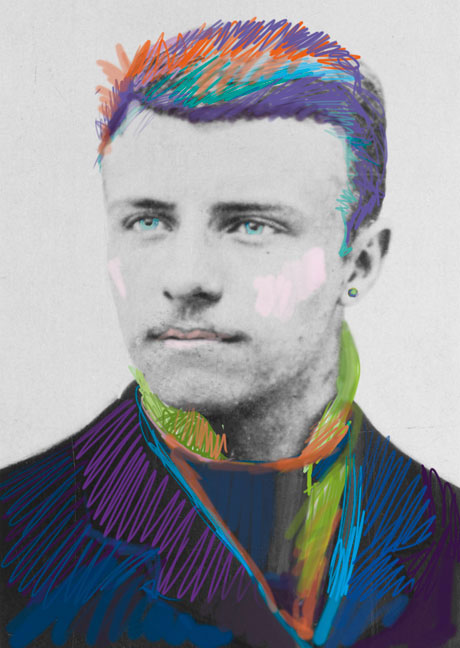 August15th, 2016 "Theodore at Harvard" Just horsing around, an embelished photo of Theodore as a young gent at Harvard...He was a stylish, progressive guy, I thought he might of enjoyed being represented so colorfully... |